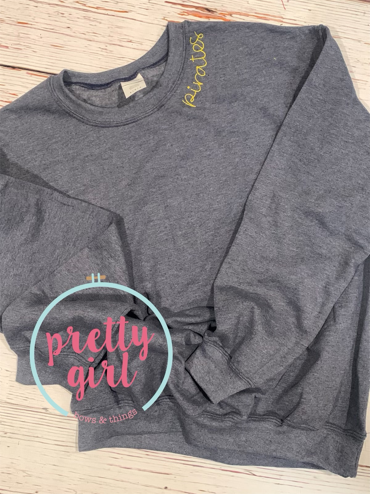 Pirates sweatshirt shown is on Heather sport dark navy with yellow thread.